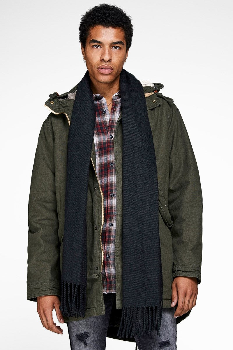 Jack & Jones sort halstørklæde i et blødt og behageligt polyester og akryl materiale, hvor polyestert er af genanvendeligt materiale. Detalje med et lille logolabel og frynser i enderne. B: 68cm. L: 1,80 cm. Kvalitet: 50% akryl, 50% recycled polyester.