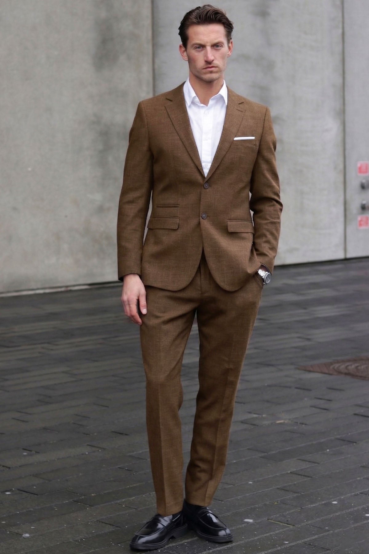 - Materialer: 54% polyester, 24% uld, 20% hør, 2% elastan