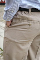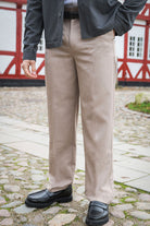 - Bukserne har læg foran og lukkes med knap og lynlås
