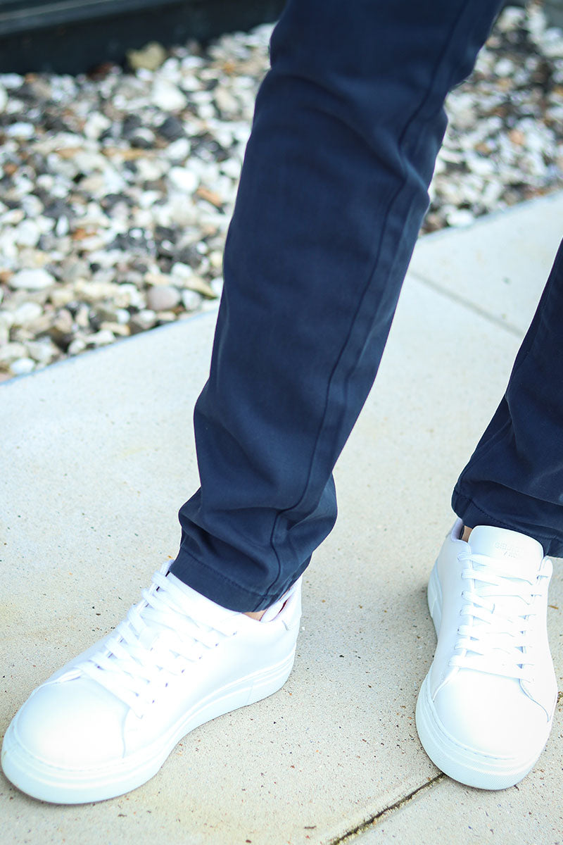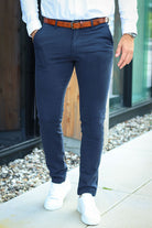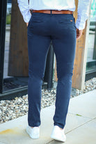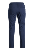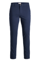 Lækre Jack & Jones Chinos i farven navy blazer. Kommer med skrå lommer foran og slidslommer bagpå. Spændes med knap samt zip. Behagelig bomuldskvalitet med stretch. Jack & Jones logobadge påsyet over højre baglomme. Kvalitet: 98% bomuld 2 % elastan.