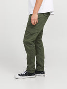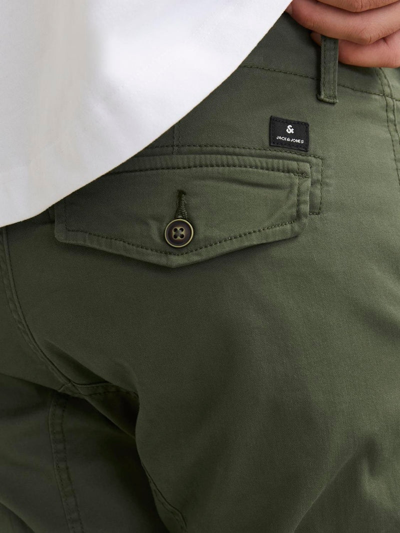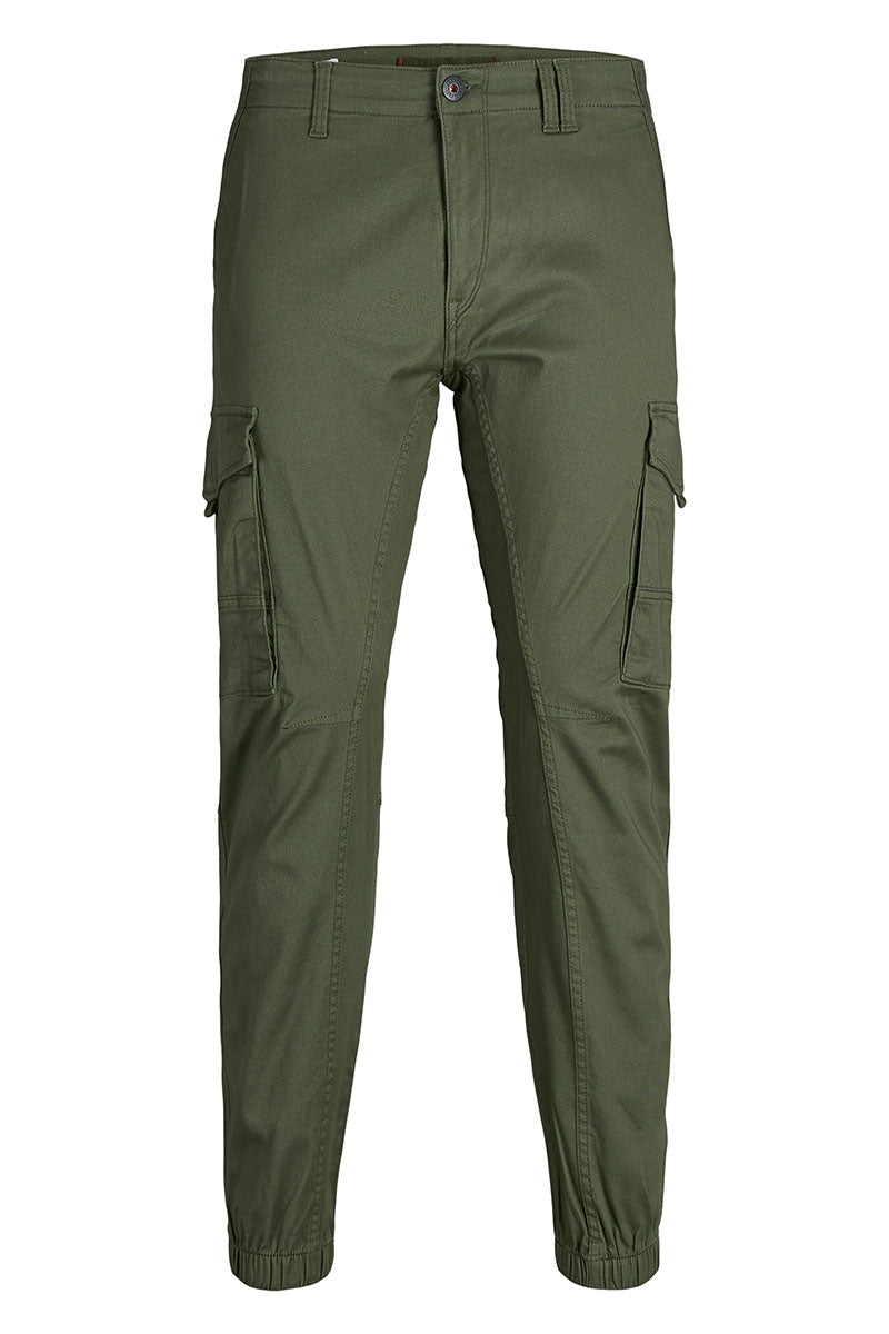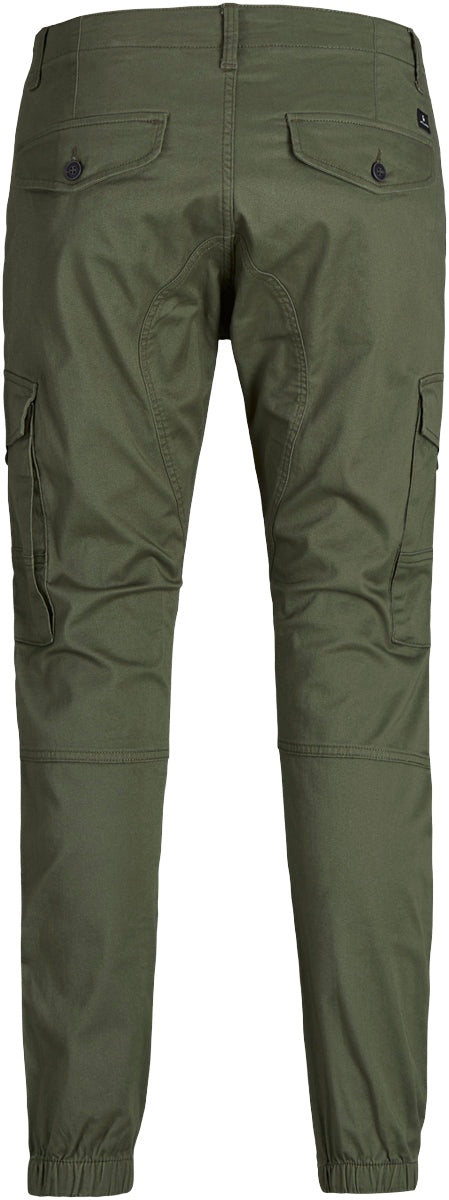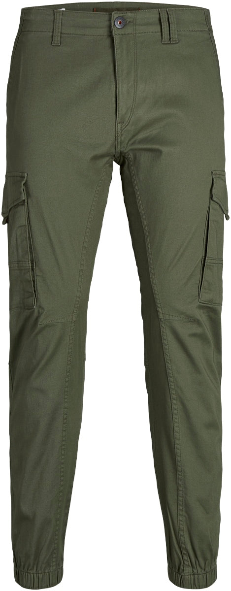 Jack & Jones cargo pants med tapered fit. Kommer i et komfortabelt twill materiale med stretch. Stoffet er behandlet med et økovenligt enzymvask, som giver den army grønne farve et slidt look. Udstyret med med signaturelommer på lårene, to frontlommer og to baglommer. Spændes med lynlås og topknap. Kvalitet: 98% bomuld, 2% elastan.
