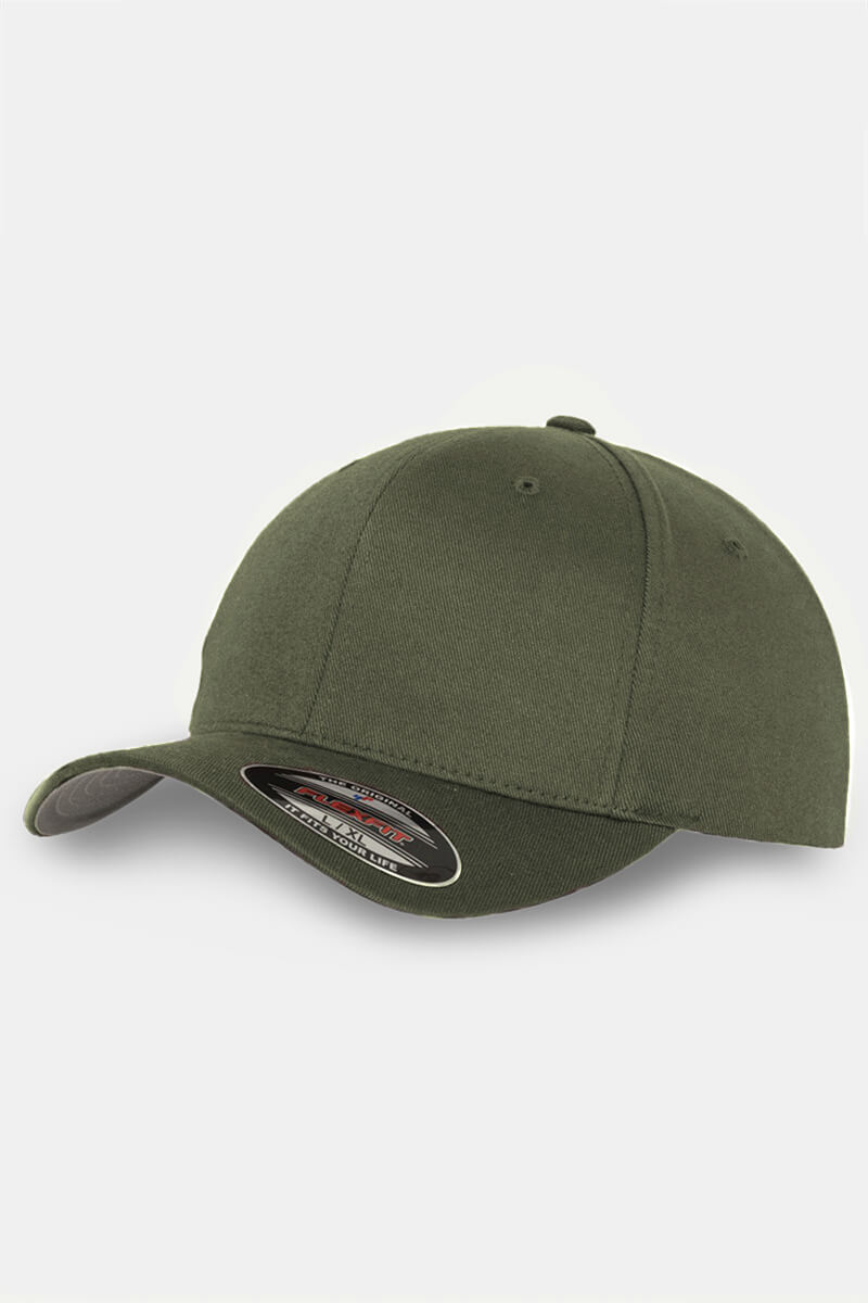 Flexfit original stretchable fitted cap er en meget fleksibel cap med elastikkant rundt hovedet. En klassisk model, med flexfit klistermærke på bremmen. Kommer her i olivengrøn.