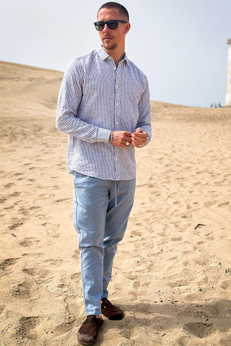 Som med det meste andet tøj kan man, også med hør, justere på pasformen, for at få lige nøjagtig det look og udstråling man er efter. Det er, som med t-shirts, blevet meget populært at style især de kortærmede hørskjorter en smule oversized. Dette giver øget komfort til de i forvejen meget behagelige skjorter, og samtidig giver det også et mere urban look, præget af streetwear tendenser. Man kan selvfølgelig også, som man typisk gør med almindelige skjorter af bomuld, gå efter et mere stramt siddende fit, hvis man ønsker dette. På den måde kan man altså både dresse hørskjorter op og ned, afhængig af hvilken anledning og udstråling man går efter. Leder du efter en formel skjorte til arbejdet, som blot er mere åndbar til de varme sommermåneder? Så prøv en af vores langærmede hørskjorter. Eller måske skal du på ferie til sydens sol og bare slappe helt af? Så prøv en kortærmet hørskjorte med mønster. Det samme gør sig gældende for hørbukser og shorts. Man kan både style dem helt ned, og bare have en t-shirt og et par solbriller på, eller gå all in og tage en skjorte (måske også i hør) på og dermed få et mere formelt look. Man kan ligeledes justere på pasformen, alt efter ens personlige præferencer.