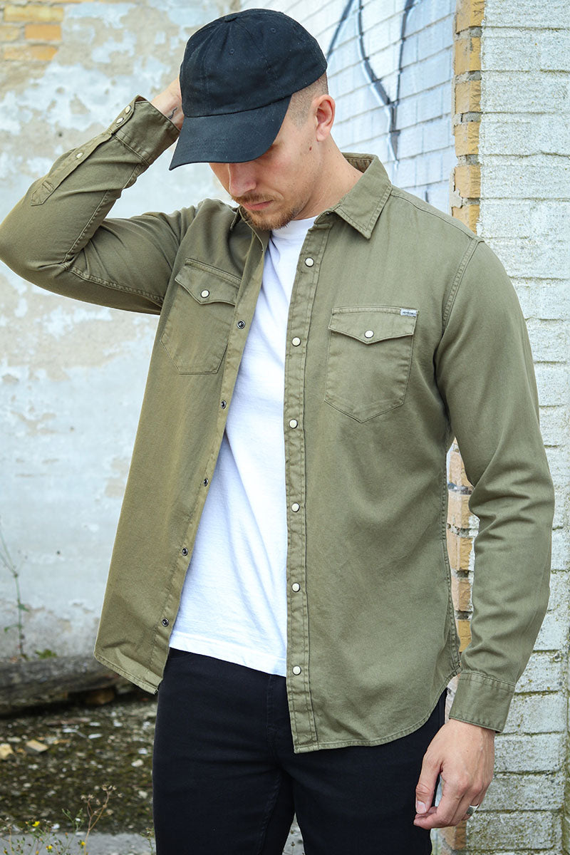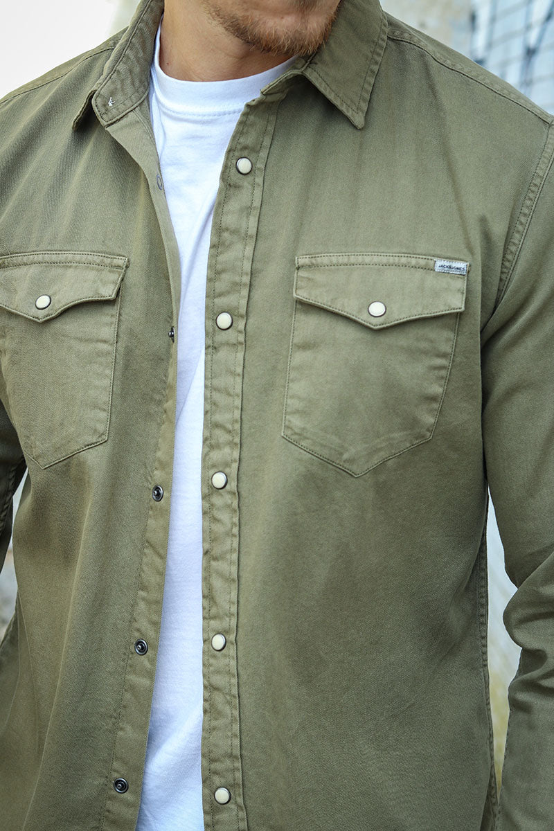 - Skjorten har to brystlommer med knap og en rundet bund.