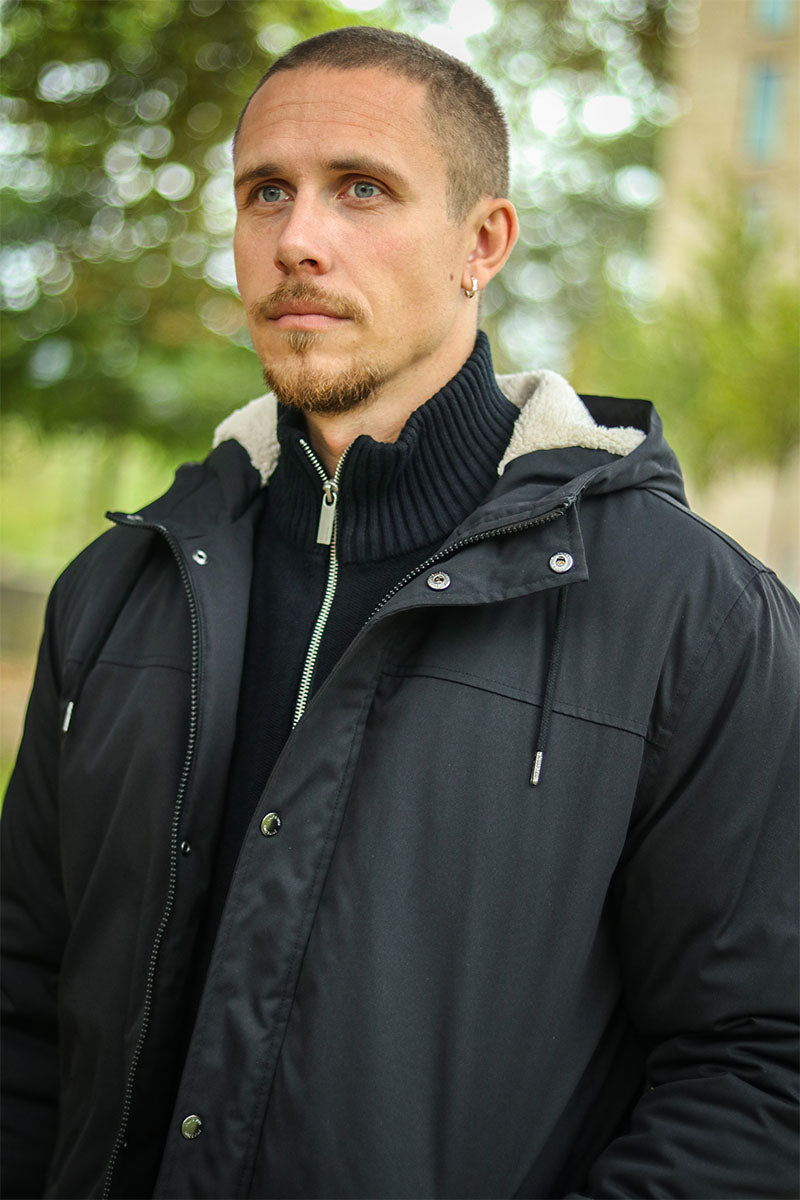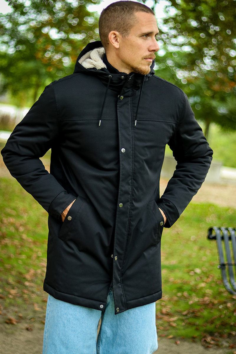 - Lang vinterjakke med knappelukning og lynlåslukning