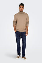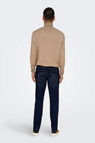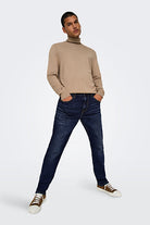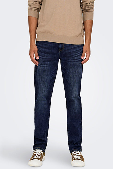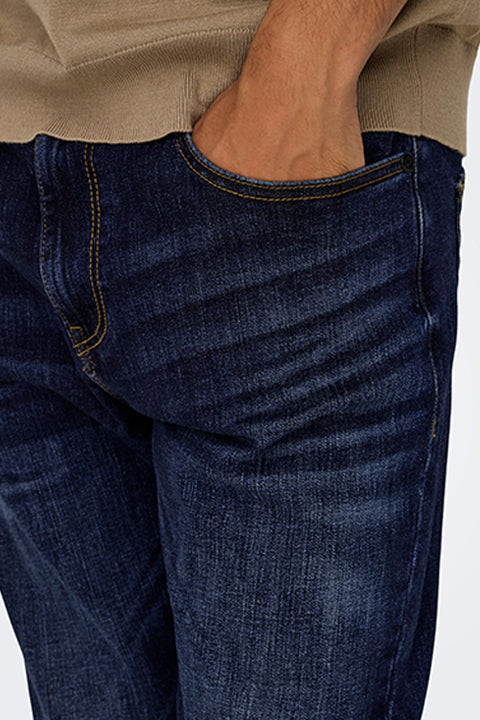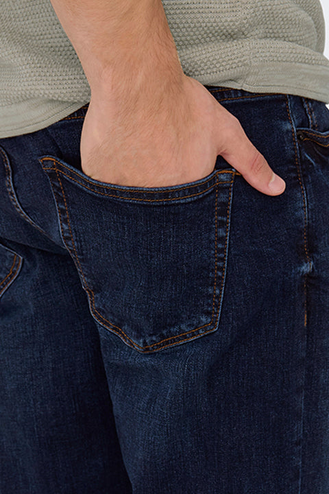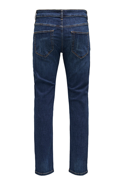 - Mørkeblå jeans med lynlåslukning i slim fit