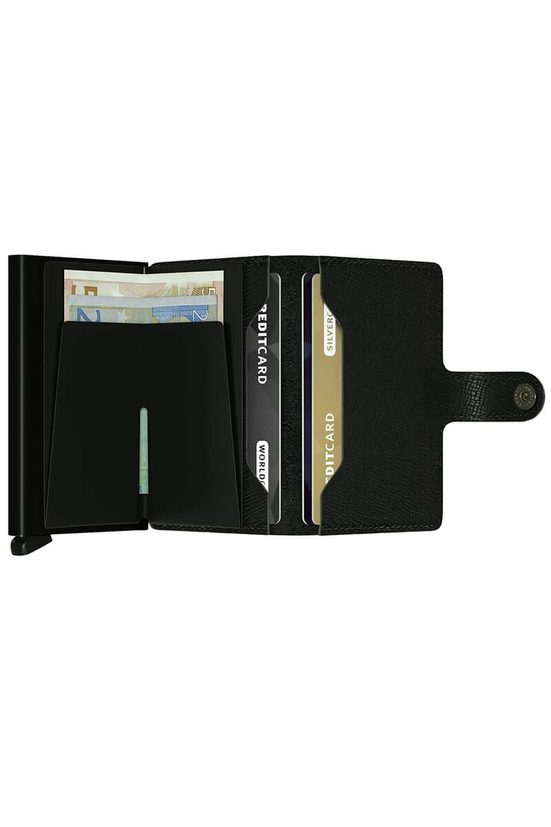 Secrid miniwallet er en kombineret tegnebog og kortholder i en. Kan opbevare op til fem kort, som hurtigt kan skubbes op så du nemt kan komme til dine kort. Der er ligeledes plads yderligere fire kort, sedler og kvitteringer. Beskytter mod slid og RFID scanning. Fremstillet i aluminium og er beklædt med læder, hvilket givet et eksklusivt udtryk. Kortet måler: 10,2 x 6,5 x 2,1 cm og har en vægt på 72 g.