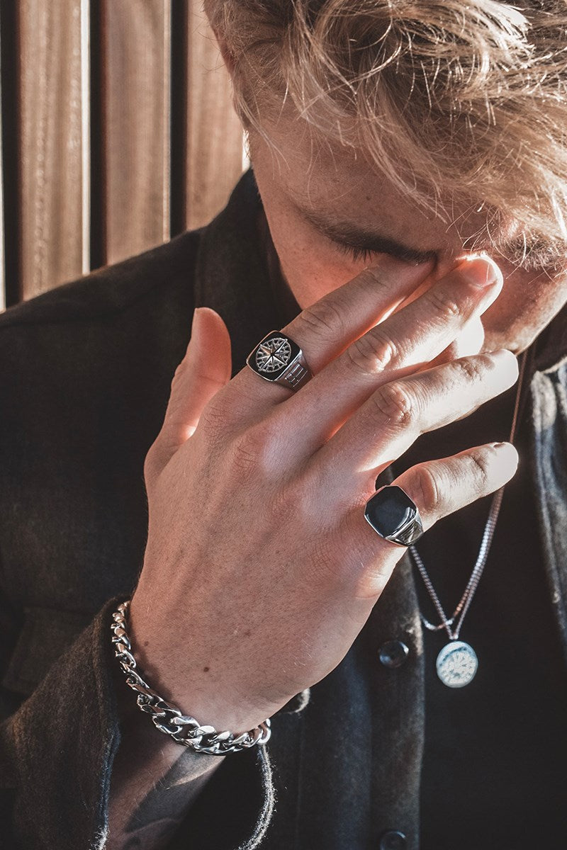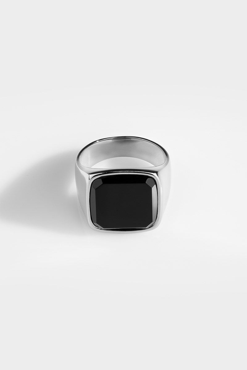 Northern Legacy oversized ring i stål med sølv look. Denne model har en 18x18mm overflade. Ringen har en naturlig sort onyx sten. Ringen er lavet i 316L rustfrit stål og har Northern Legacy indgraveret invendigt. Til dig der foretrækker en mere robust look, der er både maskulin og eksklusiv.