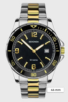 Sekonda 1581 Two-Tone Sports Ur i flot design med sort skive med forgyldt indeks, samt two-tone lænke og forgyldt krone. Uret er udstyret med datovisning, og er vandafvisende ned til 5 ATM, hvilket svarer til 50 meters dybde. Kvalitet: Rustfrit stål, vandafvisende 5 ATM, kvarts urværk