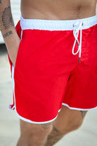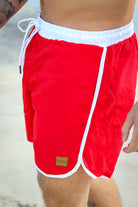 Badeshorts fra Urban Classics. Retro badesbukser i rød og hvid. På venstre ben er der påsyet 'Urban Classics' logo i gummi. Kommer med hvid snor og indvendigt net. Der er to forlommer og en baglomme som kan lukkes med velkro. Kvalitet: overstof; 100% nylon. for; 100% polyester