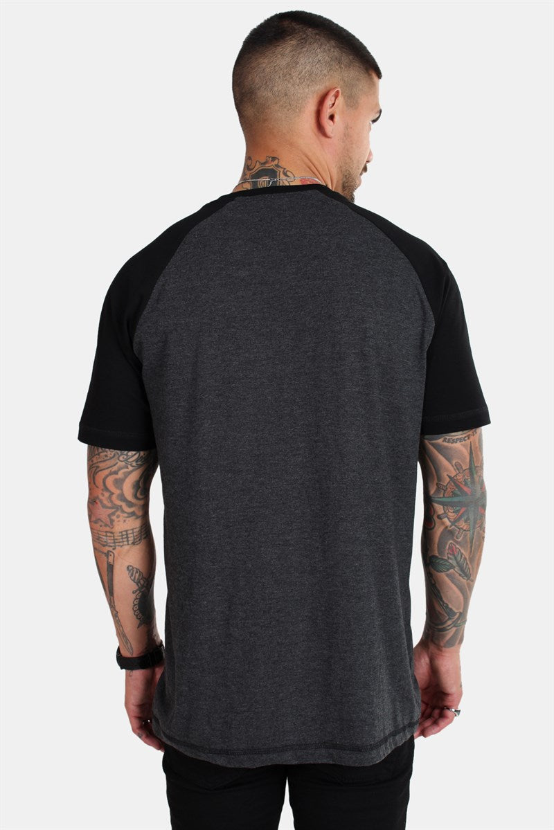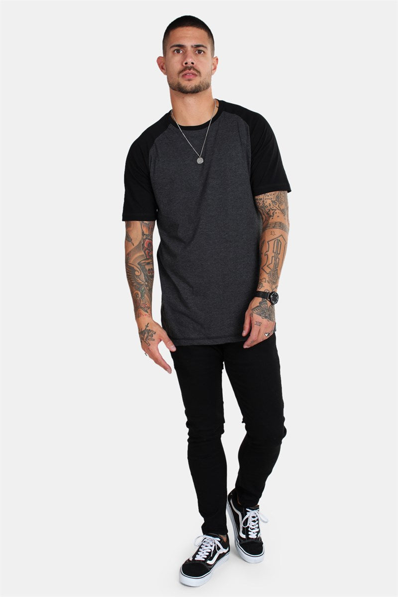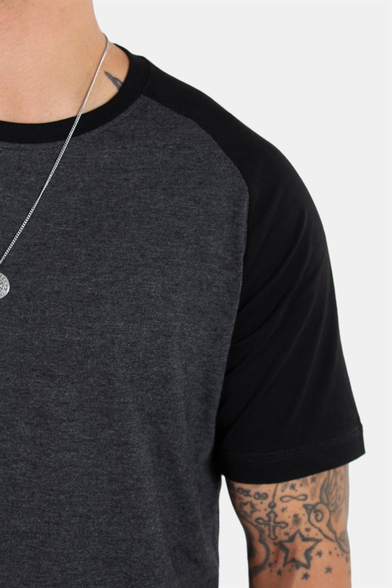Kortærmet T-shirt fra Basic i farven grå antracit og med sorte ærmer. Halsudskæringen er rund med en sort ribkant. Ærmerne har en ribkant og kan brættes op. Teen har god pasform og har en ribkant i bunden. Kvaliteten er 65% Bomuld og 35% Polyester. Denne t-shirt er stor i størrelsen. MODELLEN ER CA. 1,83 HØJ, VEJER CA. 80 KG OG BRUGER DETTE PRODUKT I STR. M