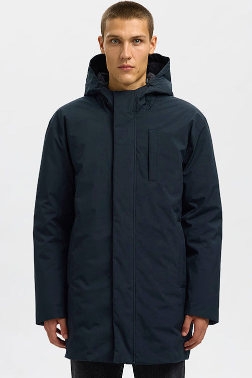 - Jakken har justerbar hætte, lommer med lynlås samt tapede sømme, der holder fugt ude. Derudover er den vindtæt, vandtæt og åndbar