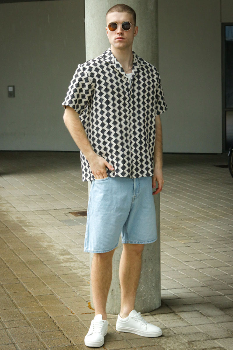 - Skjorten har korte ærmer, resort krave og knappelukning