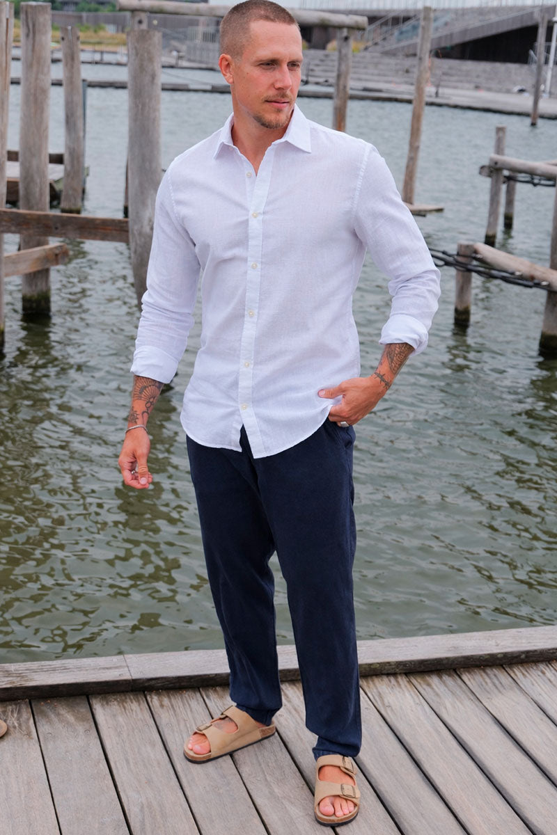 Denne lette og luftige skjorte er perfekt til en stilfuld sommergarderobe. Skjorten har en naturlig og åndbar kvalitet takket være en blanding af linned og forskellige bomuldsfibre, som sikrer komfort hele dagen. Den klassiske skjortekrave, lange ærmer og knaplukning giver et tidløst og velkendt look, mens den almindelige pasform gør den alsidig til både hverdag og mere formelle anledninger.