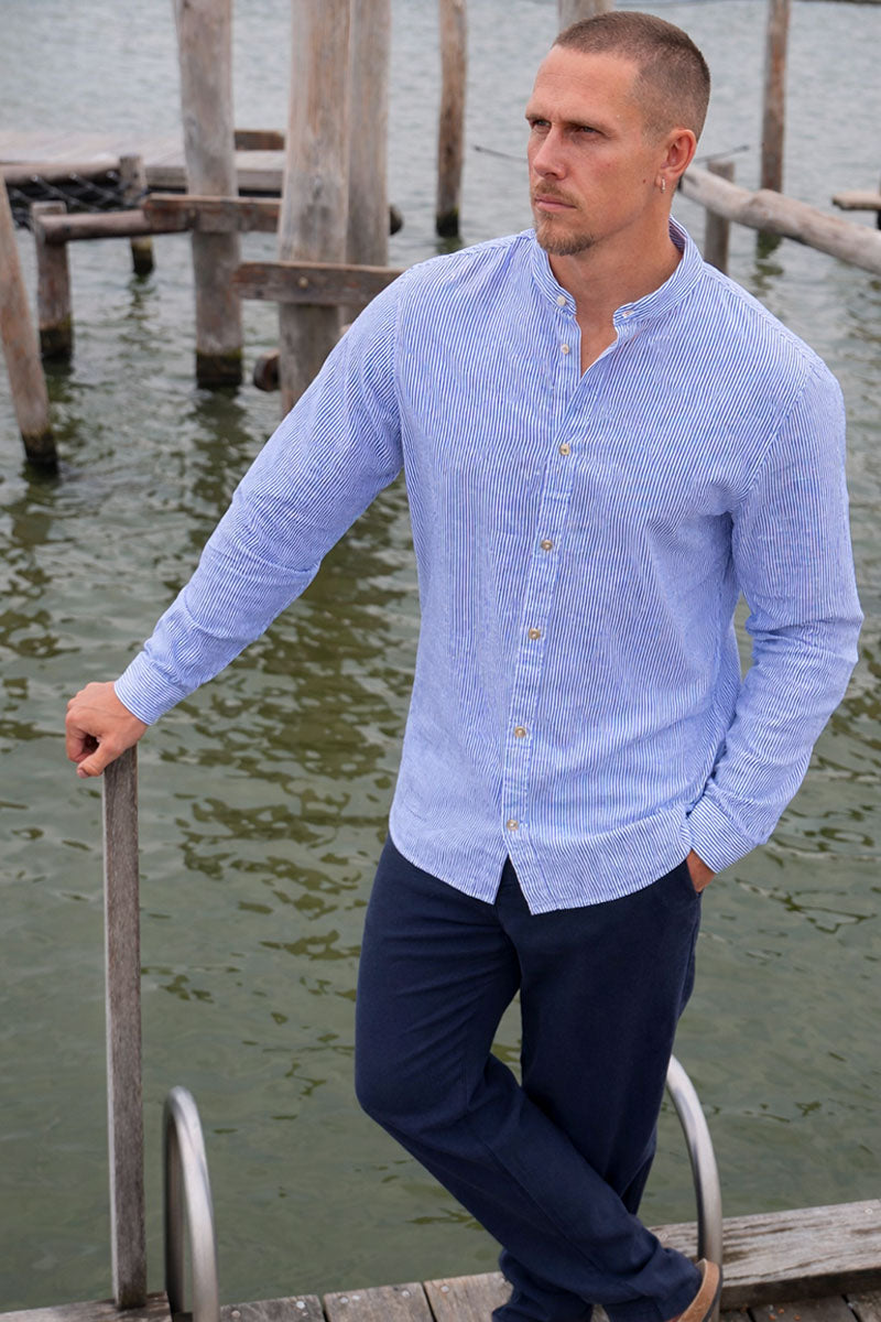 Denne lette og luftige skjorte er ideel til en stilfuld sommergarderobe. Den er fremstillet i et vævet stof, som er stærkt og holdbart uden at strække sig, hvilket sikrer et rent og velplejet look. Skjorten har en bandkrave og lange ærmer, der giver et klassisk og moderne udtryk i en regular fit pasform.