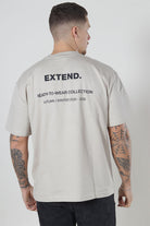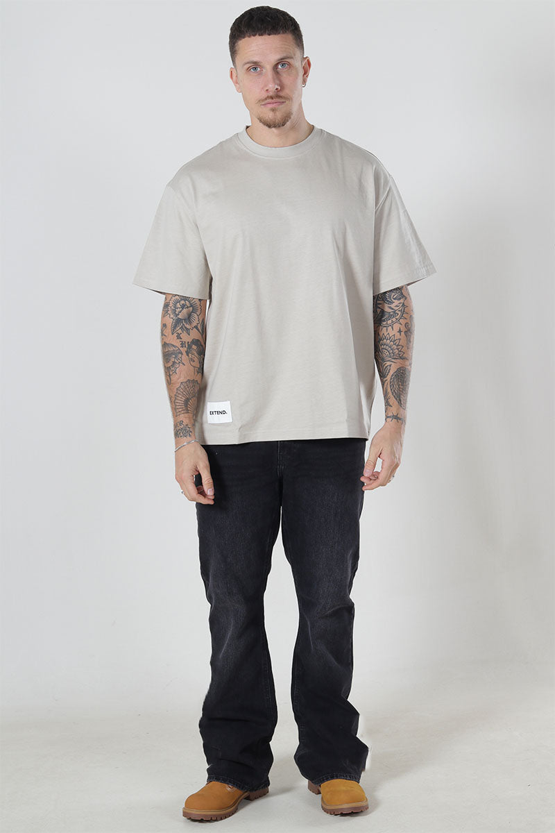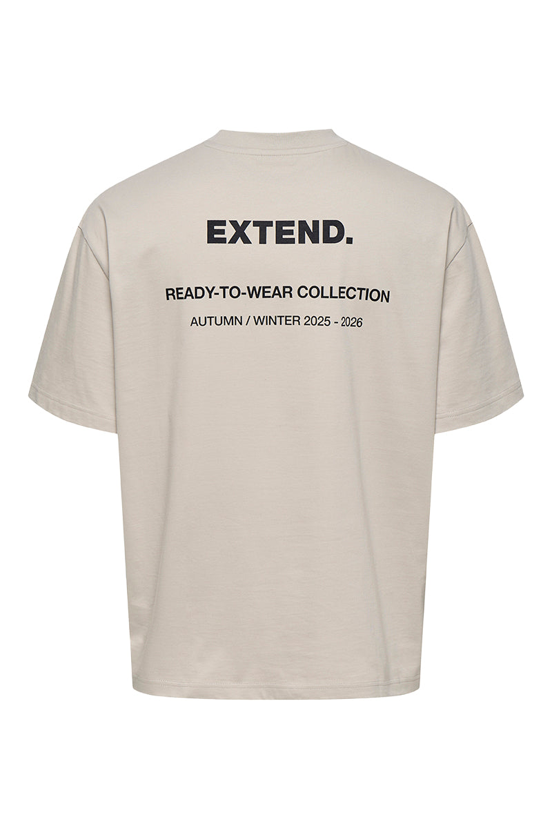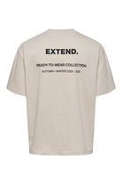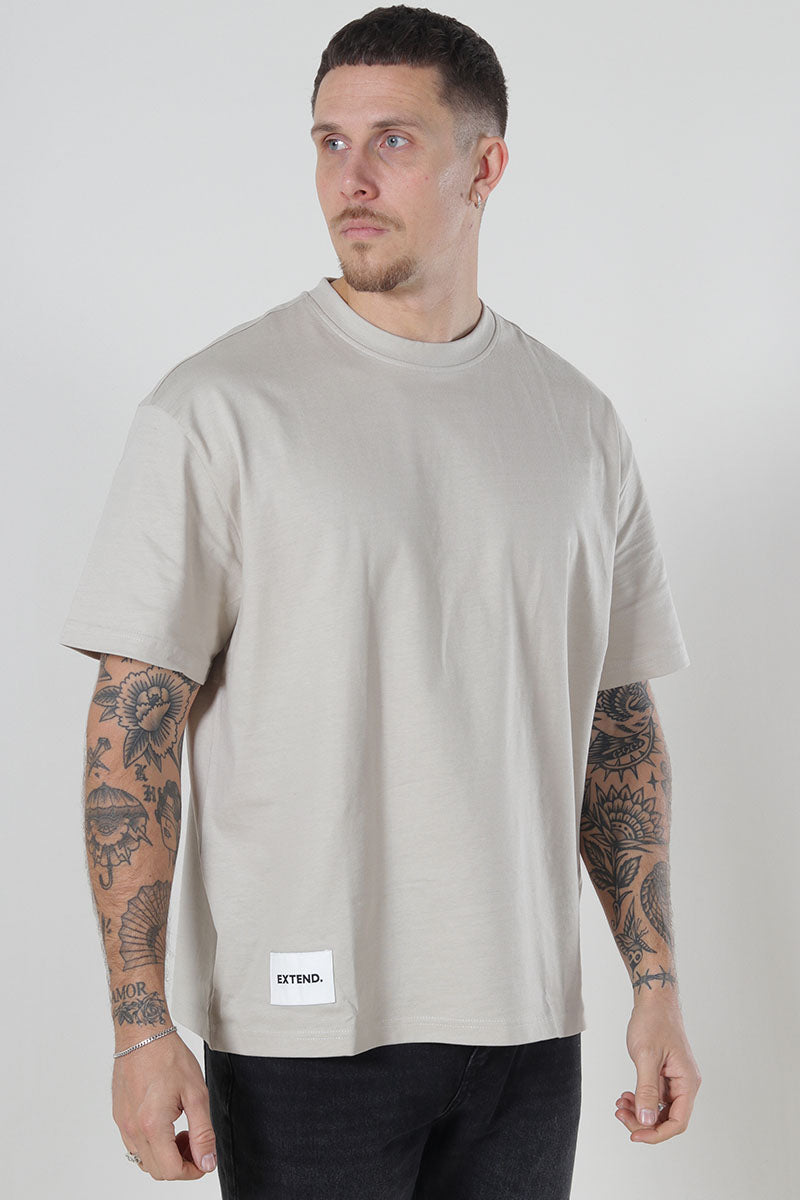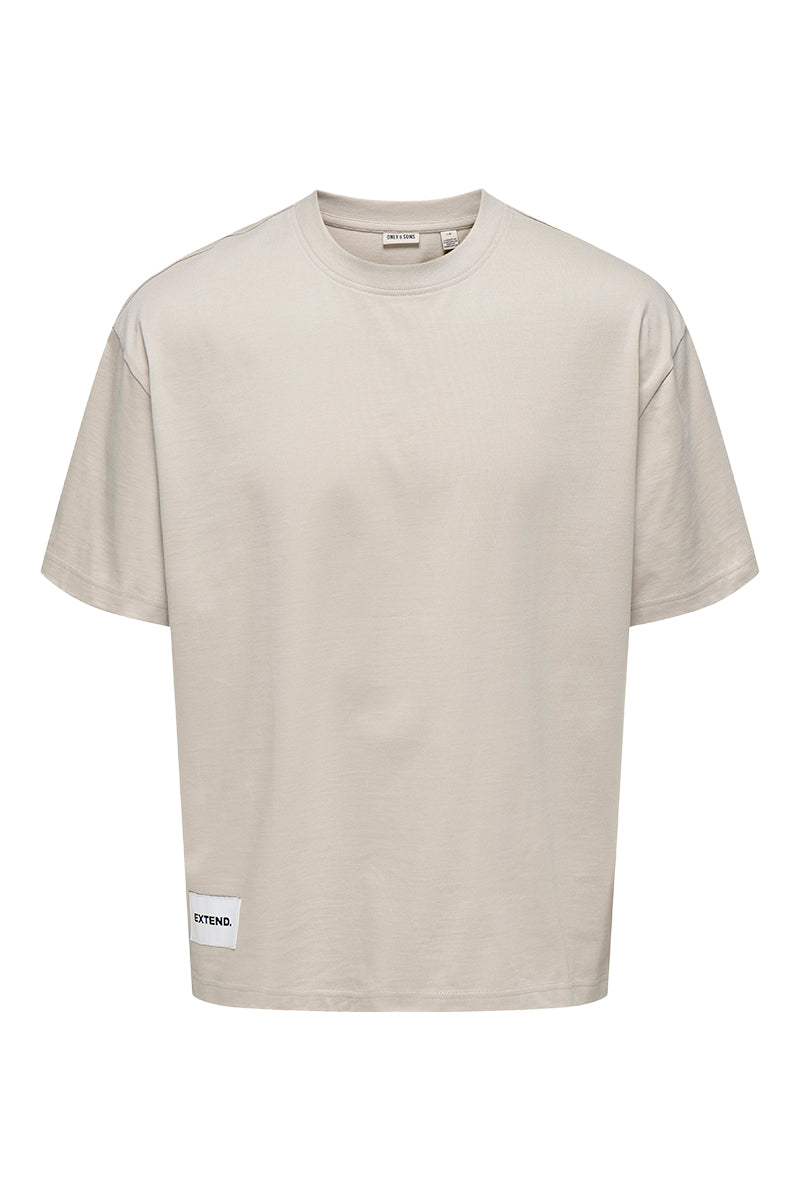 - T‑shirten har tekstprint på ryggen samt et lille påsyet mærke i siden