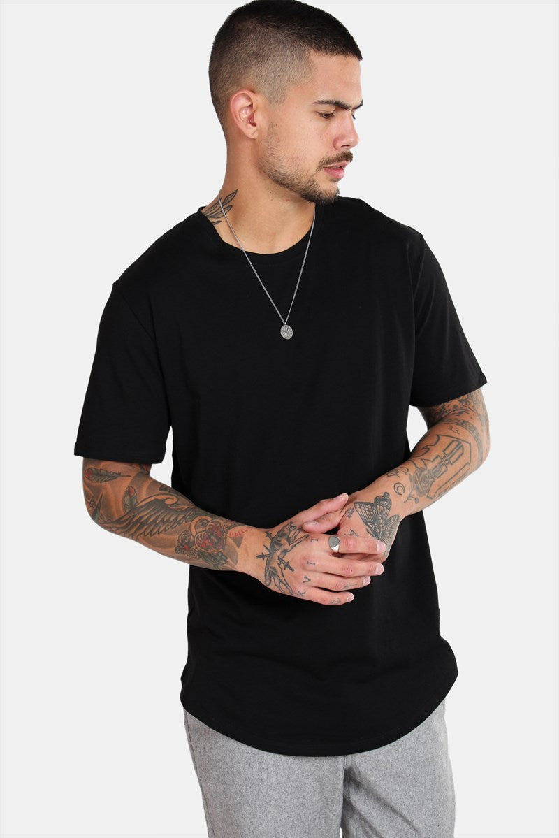 Basic Only & Sons T-shirt i sort. Klassisk longline model som er afrundet i livet. Kommer med rund hals med smal ribkant. Detalje i venstre side af livet med Only & Sons logotag. Kvalitet: 100% bomuld.