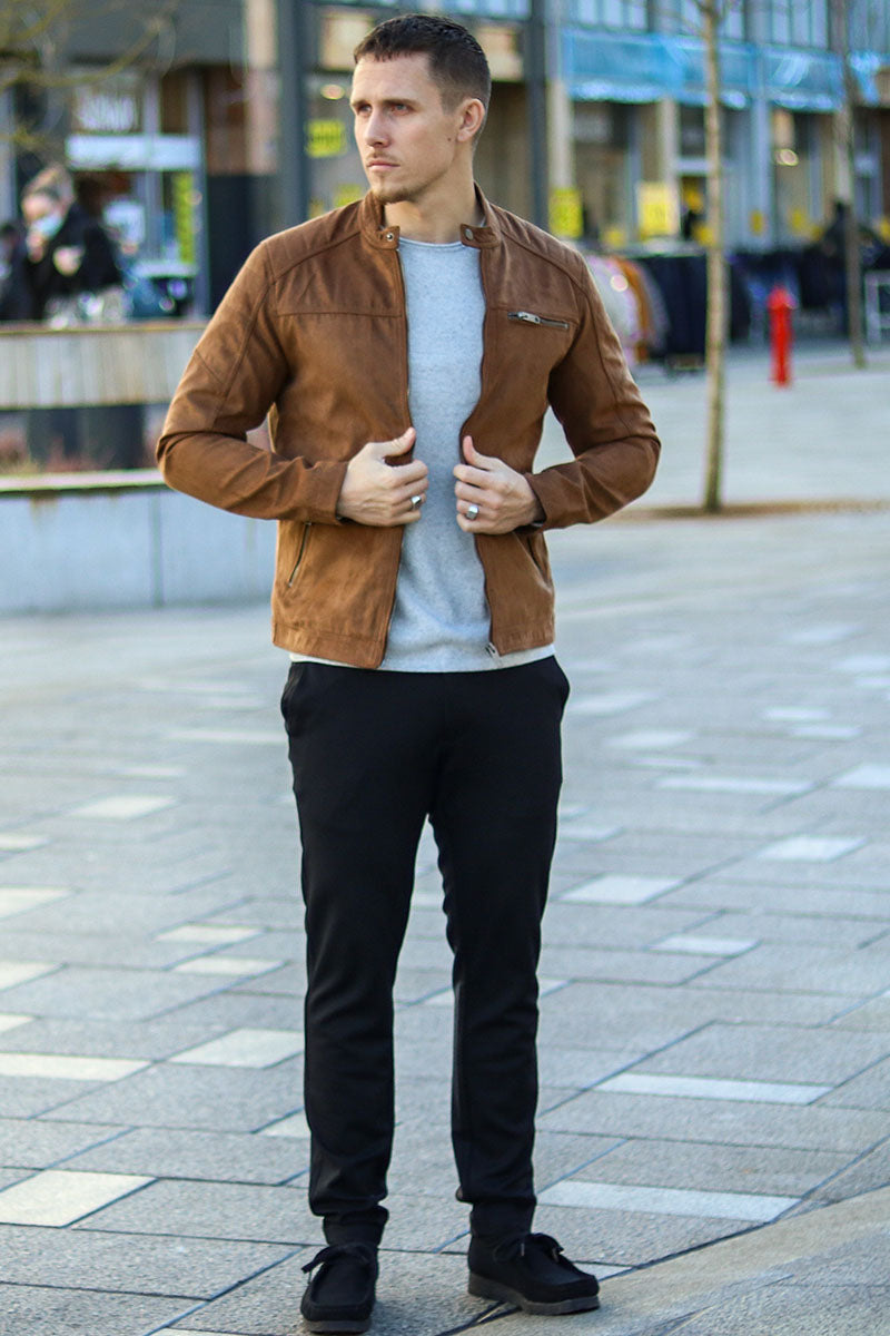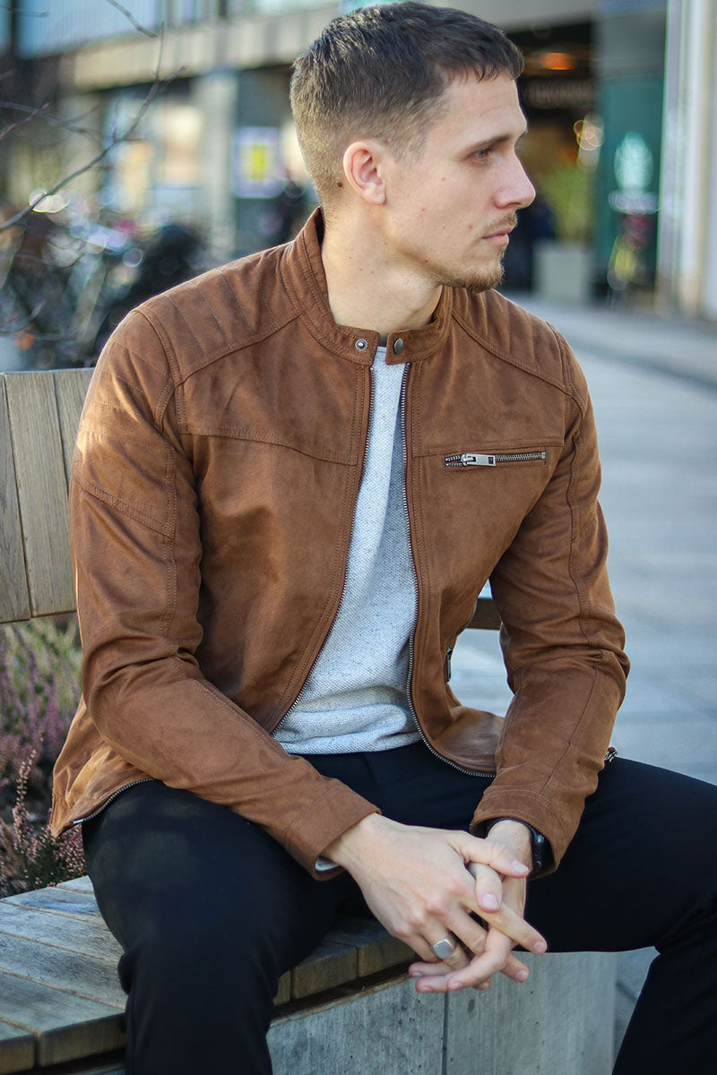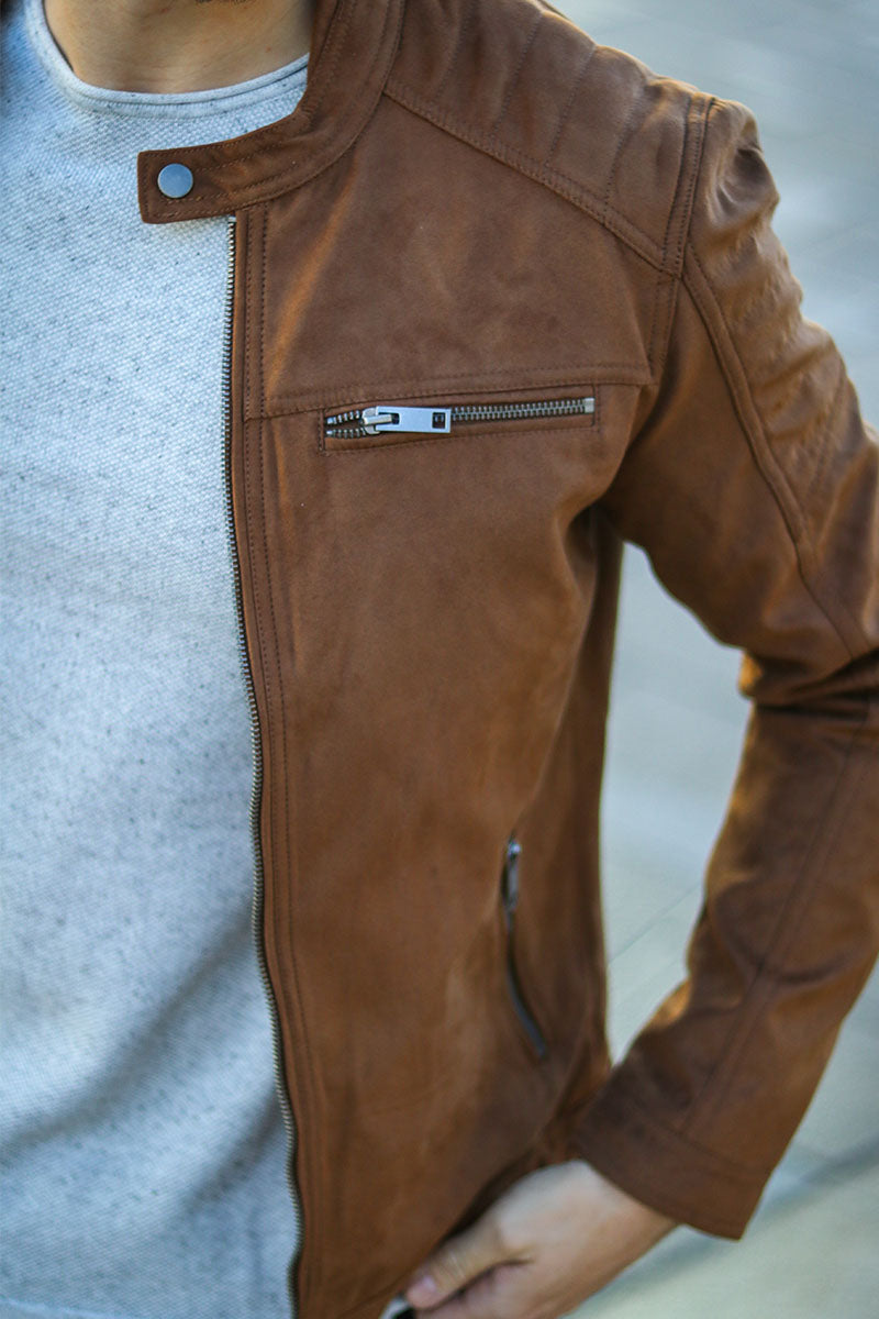 Jack & Jones jakke i cognac farvet imiteret suede. Jakken er med Mao krave, lynlås lukning og fire lommer, hvoraf de tre udvendige også er med lynlås. Padded biker detalje på skulderne giver et råt look. Kvalitet: 100% polyester, For: 100% polyester.