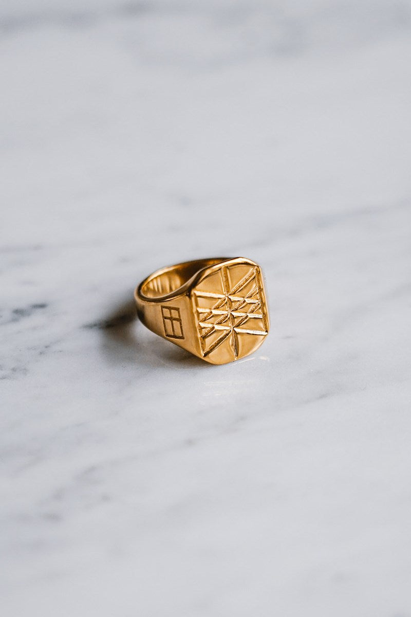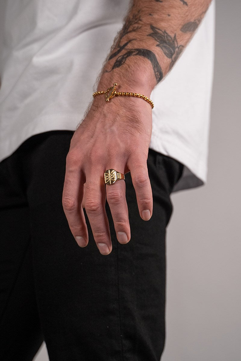 Northern Legacy guldtonet ring med 13x18mm overflade, hvor vikinge symbolet "Web og Wyrd" er graveret. Det brede stykke af siderne er ligelede ledes graveret med flag. Ringen er lavet i 316L rustfrit stål og har Northern Legacy indgraveret invendigt. PVD belagt, med høj korrosionsbestandighed. 100% nikkelfri. Håndlavet
